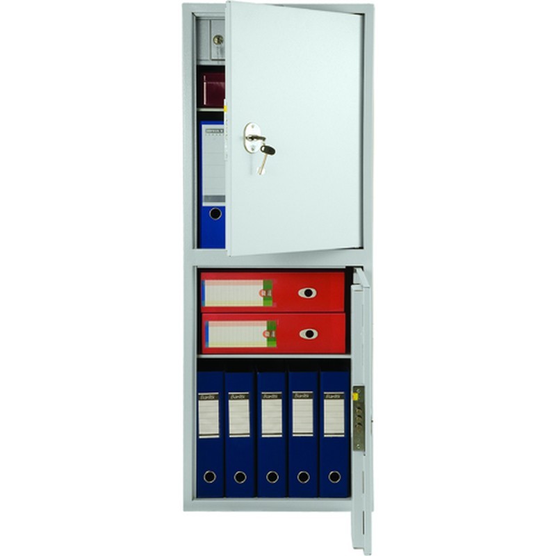 Шкаф для документов (сейф) «Практик» изготовлен из металла с порошковым покрытием серого цвета. Размеры — 125,2×46 см, глубина — 34 см. Разделен на два отделения, каждое со своей дверью. Обе двери оснащены ключевым замком. Внутри каждого отделения съемная полка с возможностью регулировки высоты. В верхнем отделении также есть ячейка, которая запирается на отдельный ключ. Шкаф вмещает большой объем документов, удобен для хранения архивных папок.