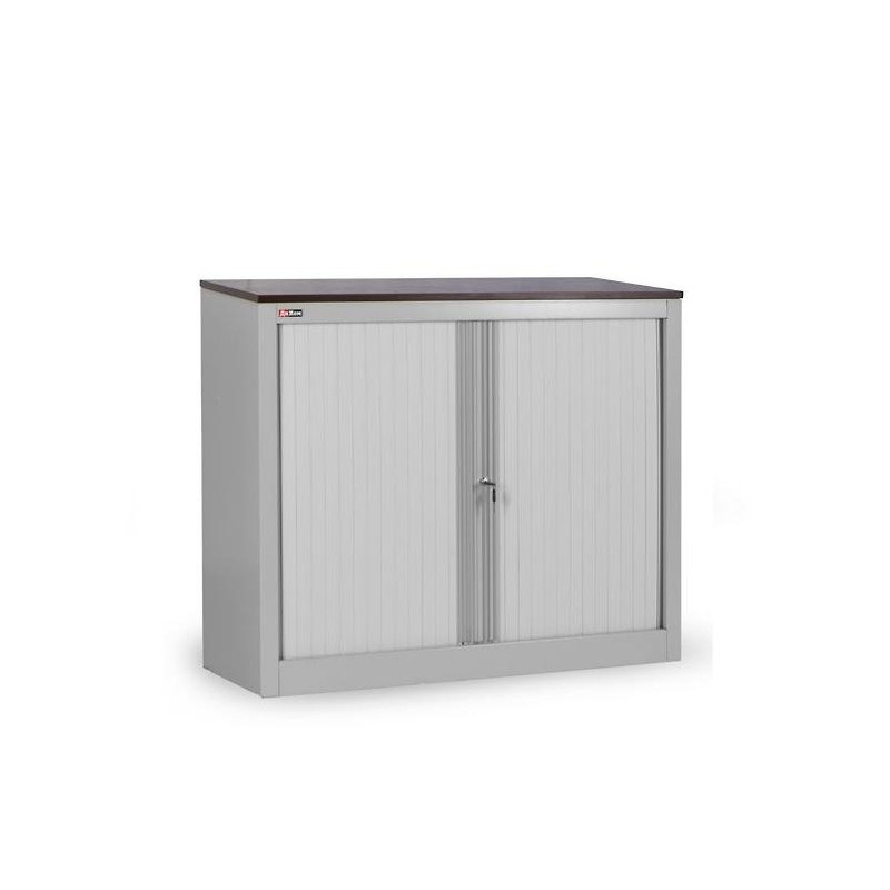 Тамбурный шкаф КД141 подходит для хранения документов и личных вещей в офисе. Имеет размеры 88×100 см и глубину 48,5 см. Корпус металлический серого цвета. Сверху — столешница из ламинированной деревоплиты (ЛДСП) цвета орех. Две двери-жалюзи выполнены из пластиковых панелей серого цвета, оснащены магнитными защелками и ключевым замком, раздвигаются — не требуют пространства для открывания. Внутри шкафа одна полка с возможностью регулировки высоты. Ножки также могут регулироваться.