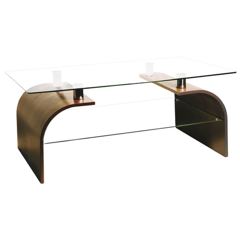 Журнальный стол «Колизей» имеет две гнутые опоры из деревоплиты (МДФ) со шпоновым покрытием цвета орех. На них при помощи металлических держателей установлена столешница размером 100×60 см из прозрачного стекла. Между опорами — дополнительная стеклянная полка. Высота журнального стола — 50 см.