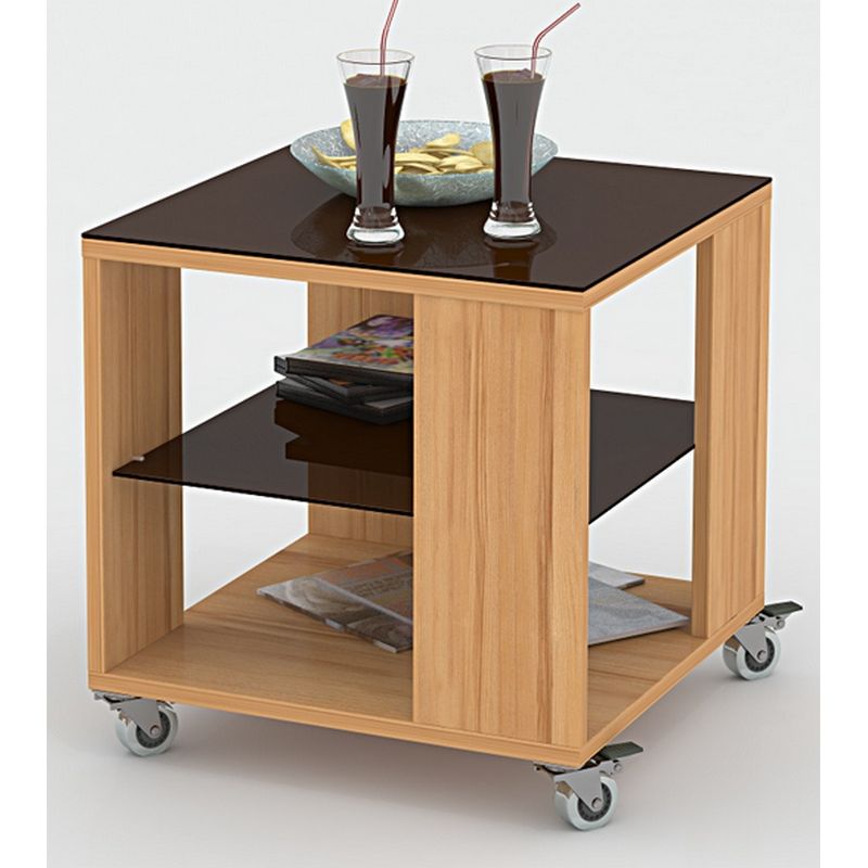 Журнальный стол BeautyStyle 6 имеет размеры 45×45 см и высоту 50 см. Корпус выполнен из ламинированной деревоплиты (ЛДСП) цвета бук, кромки отделаны лентой из ПВХ для защиты от повреждений и разбухания. Столешница и дополнительная полка — из стекла темно-коричневого цвета толщиной 8 мм. Журнальный стол оснащен четырьмя колесиками для удобного перемещения.
