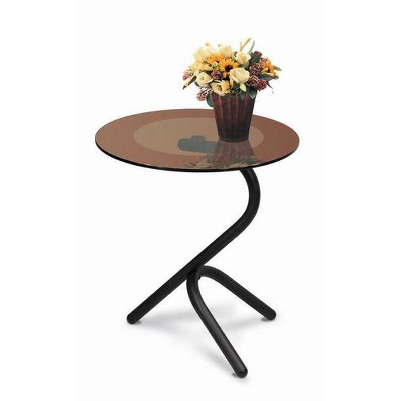 Журнальный стол «Дуэт» имеет круглую столешницу диаметром 50 см из прочного тонированного стекла. Основание изогнутой формы выполнено из металла с покрытием черного цвета. Высота журнального стола — 55 см.
