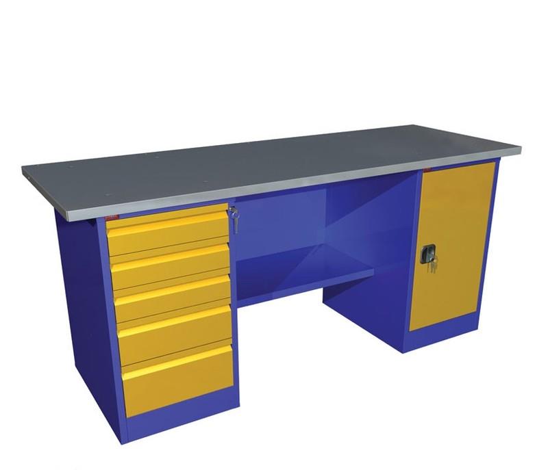 Двухтумбовый верстак, предназначенный для рациональной организации рабочего места мастерской или производственного помещения. Модель состоит из столешницы (МДФ, покрытая оцинкованным листовым металлом, нагрузка до 300кг) , задней металлической стенки, тумбы с двумя съемными полками, тумбы с выдвижными ящиками на ключевом замке и верстачной полки. Верстак может комплектоваться перфорированным экраном арт.355276, с возможностью крепления крючков (арт.355281, 355282) и держателей для инструмента (арт.355279, 355280). Размеры верстака — 1900×685×860 мм.