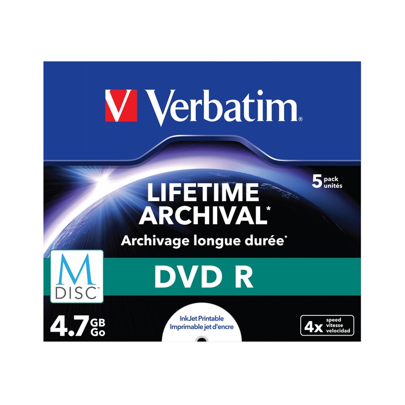 "Verbatim M-Disc DVD R- это 5 записываемых дисков емкостью 4.7 ГБ, скоростью записи 4х. Диски покрытие для струйной печати по всей поверхности