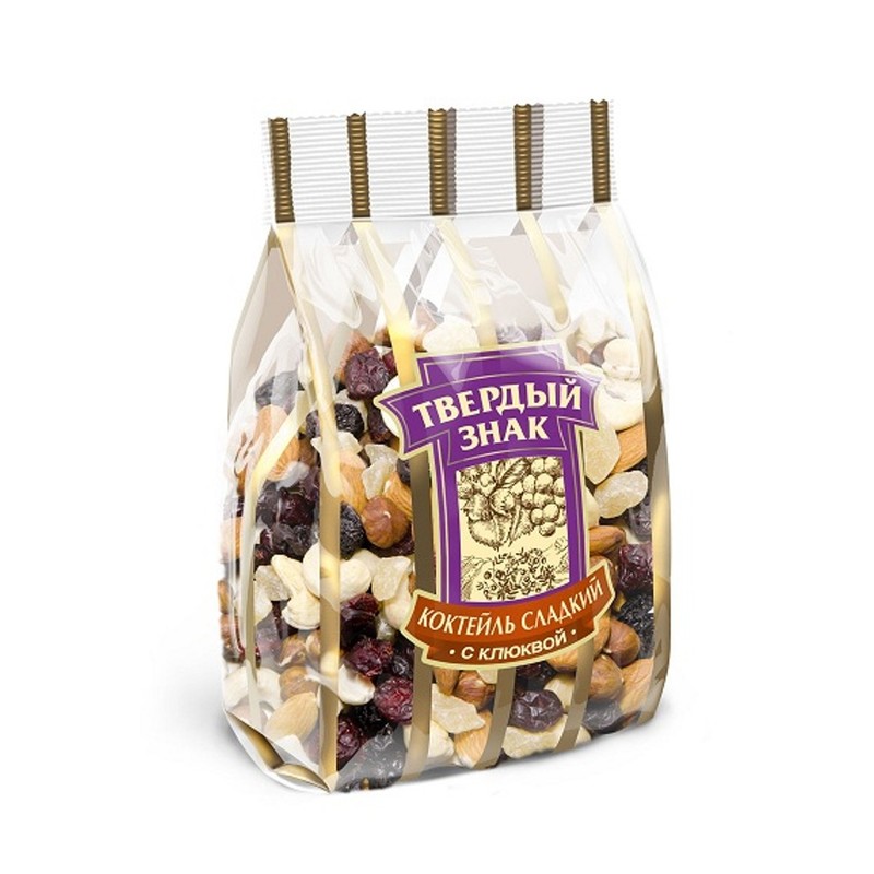 Один из самых популярных коктейлей торговой марки <Твердый Знак>. В нем вы найдете простой и понятный микс любимых орехов и сухофруктов: миндаль, кешью, фундук плюс полезные ягоды клюквы. Такой микс часто используется для отменной домашней выпечки, чаепитий или просто как полезный способ перекусить на работе или в пути.