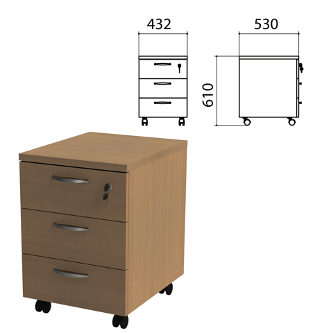 | Тумба подкатная "Этюд" (ш432*г530*в610 мм), 3 ящика, замок, дуб онтарио 160, 400063, ш/к 07002 |