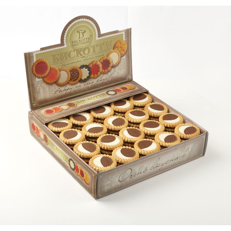 "Великолепное рассыпчатое печенье, дополненное затейливым сочетанием двух кремов(шоколадного и молочного) в начинке.""Донышко"" печенья покрывается шоколадной глазурью.