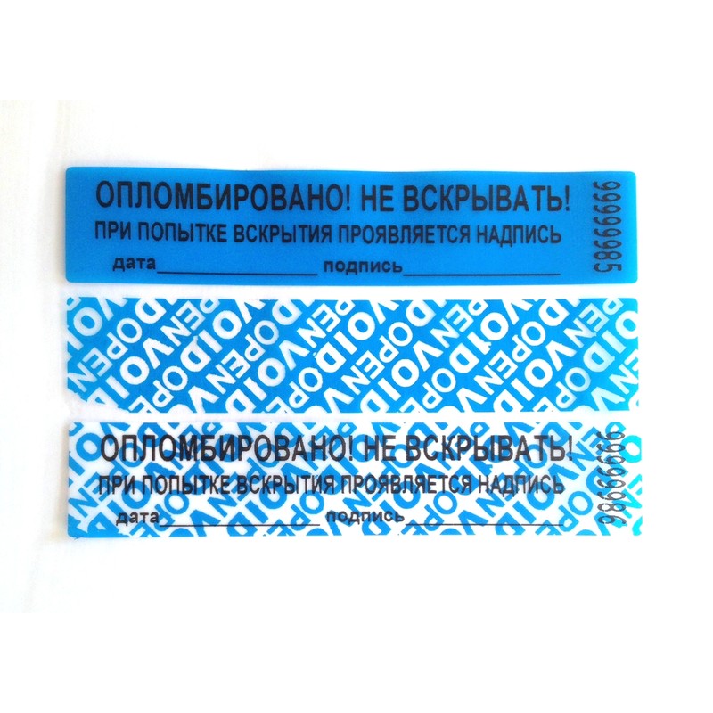 Пломбы-наклейки относятся к пломбам, применяемым для индикации несанкционированного доступа к охраняемому объекту. Особые свойства материала, применяемого для изготовления этих индикаторных пломб, не позволяют использовать их повторно после вскрытия опломбированного объекта, так как на наклейке появляется надпись "OPEN VOID" (ВСКРЫТО). Данные наклейки оставляют след на наклеиваемой поверхности. Конструктивно индикаторные пломбы представляют собой самоклеющуюся пленку с двухслойным термозащитным покрытием с маркировкой <ОПЛОМБИРОВАНО! НЕ ВСКРЫВАТЬ! ПРИ ПОПЫТКЕ ВСКРЫТИЯ ПРОЯВЛЯЕТСЯ НАДПИСЬ> и уникальным 8-значным серийным номером. Наклейки устойчивы к воздействию пресной и морской воды, масла и бытовых моющих средств. Диапазон рабочих температур от - 40градС до +80градC. Предназначены для опечатывания и защиты компьютеров и другой оргтехники, шкафов, сейфов, металлических, пластиковых, деревянных и других поверхностей.