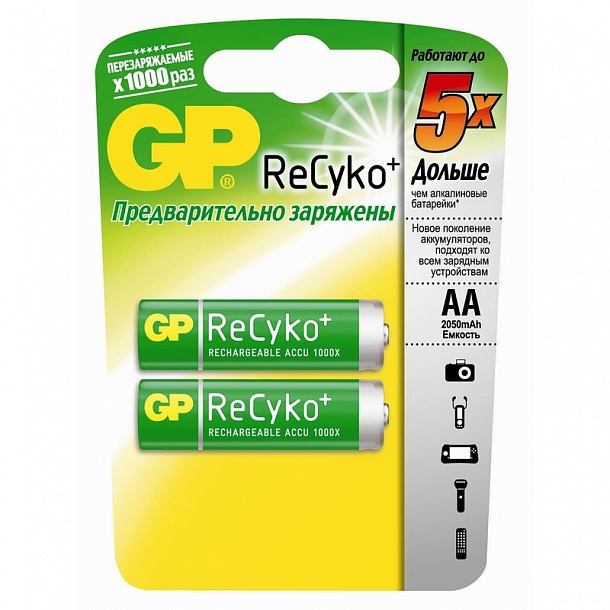 Никель-металлгидридный аккумулятор GP ReCyko+ размером АА или LR6 уже заряжен и готов к использованию. В отличие от металлогидридных аналогов в изделии отсутствует саморазряд (до 10% в год).Аккумулятор, стабильно работающий при температуре от −20 до +50 C, поставляется в блистере с подвесом в количестве 2 штук.