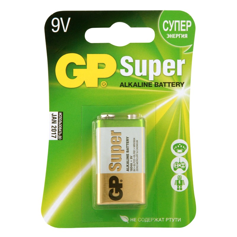 Алкалиновые батарейки GP Super F8/6LR61/Крона 9В, серии "Эко" подходящие для устройств с высоким потреблением энергии. Напряжение — 9В. Изделия обладают повышенной электрической емкостью. В комплект входят 1 батарейка стандартного типоразмера элемента питания − F8, крона. Срок службы данного элемента питания в 8–10 раз больше, чем у солевой батарейки.