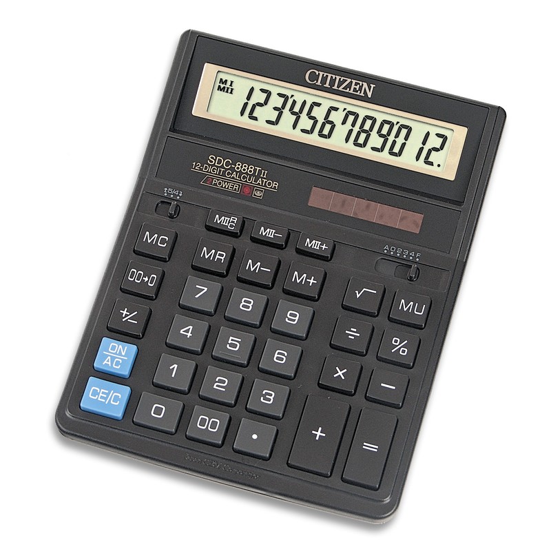 Калькулятор Citizen SDC-888TII в пластиковом корпусе с 12-разрядным ЖК-дисплеем. Имеет оптимальный набор вычислительных функций: основные математические операции, расчет процентов, извлечение квадратного корня, запоминание промежуточных результатов. Удобная клавиатура снабжена кнопкой ввода двойного нуля. Питание калькулятора автоматически отключается после пяти минут бездействия.