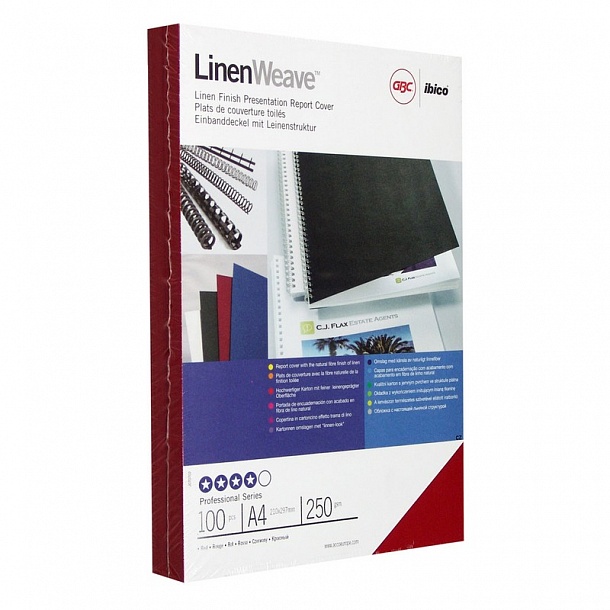 Обложки для переплета GBC формата А4 выполнены из картона красного цвета с текстурой, имитирующей лен. Плотность — 250 г/кв.м. Используются при работе с брошюровщиками (совместно с пружинами). Придают документам презентабельный вид, защищают их от загрязнений и повреждений. Применяются как для титула, так и в качестве подложки. В упаковке 100 штук.