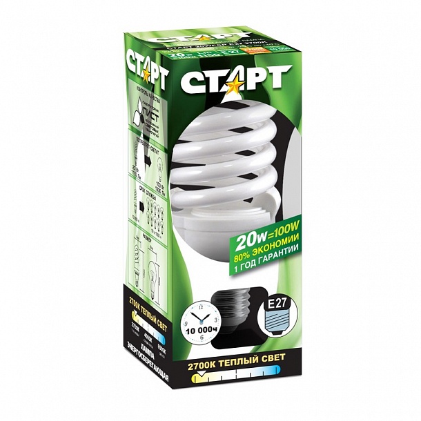 | 98193 Электрич.лампа энергосб. СТАРТ 20W(100Вт)E27 компакт.спираль тпл.бел. |