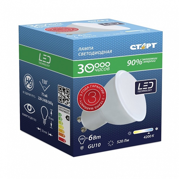 | Электрич.лампа светодиодная СТАРТ, мощн 6W, цоколь GU10, спот, хол. бел |
