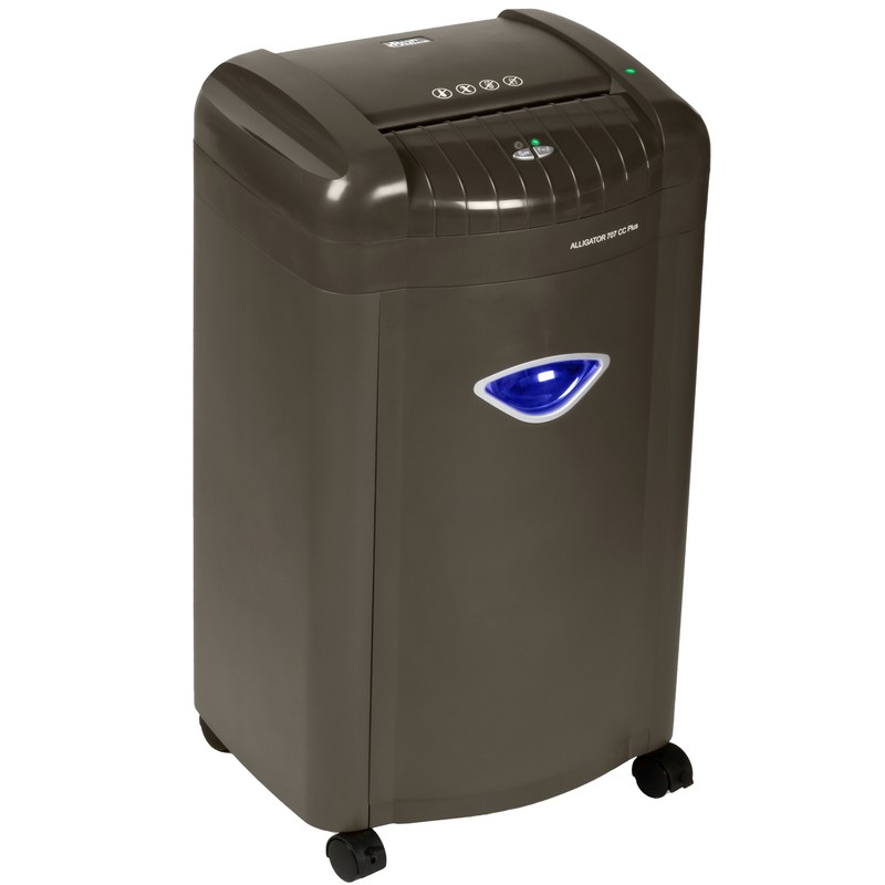 Уничтожитель документов PO Alligator 707 CC+. Модель имеет энергосберегающую систему и выдвижную 26-литровую корзину для переработанных отходов, обладает четвертым уровнем секретности, разрезает бумагу на фрагменты шириной 2 миллиметра. Уничтожитель документов снабжен функцией термозащиты мотора и колесными опорами для удобства перемещения.