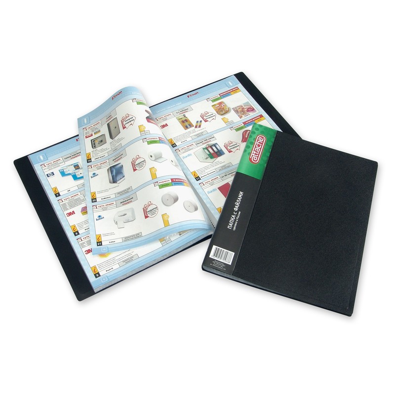 • Папка с файлами Attache предназначена для хранения материалов и документов формата А4, требующих упорядоченности и наглядного обзора: отчетов, презентаций, коммерческих и персональных портфолио. Изготовлена из пластика толщиной 0,7 мм черного цвета, имеет 30 прозрачных вкладышей, а также карман на корешке для сменной этикетки. Вмещает до 60 листов стандартной плотности.Ширина корешка составляет 17 мм. Преимуществом файловой папки является надежная сохранность документов в отличном состоянии без предварительной перфорации.