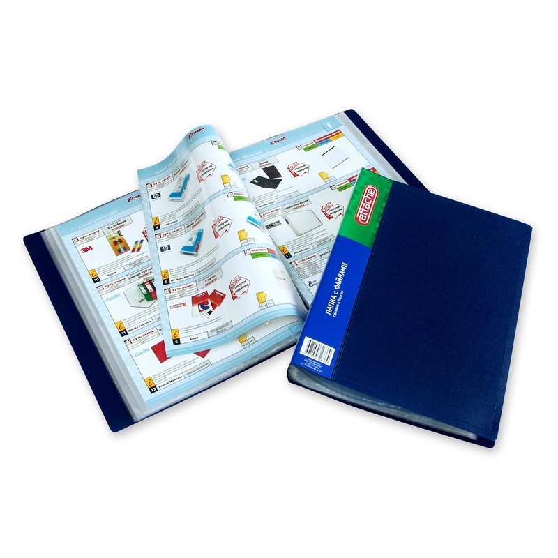• Папка с файлами Attache предназначена для хранения материалов и документов формата А4, требующих упорядоченности и наглядного обзора: отчетов, презентаций, коммерческих и персональных портфолио.Ширина корешка составляет 25 мм. Изготовлена из пластика толщиной 0,7 мм синего цвета, имеет 60 прозрачных вкладышей, а также карман на корешке для сменной этикетки. Плотность 30 мкм. Поверхность файлов - гладкая, глянцевая. Вмещает до 120 листов стандартной плотности. Преимуществом файловой папки является надежная сохранность документов в отличном состоянии без предварительной перфорации.