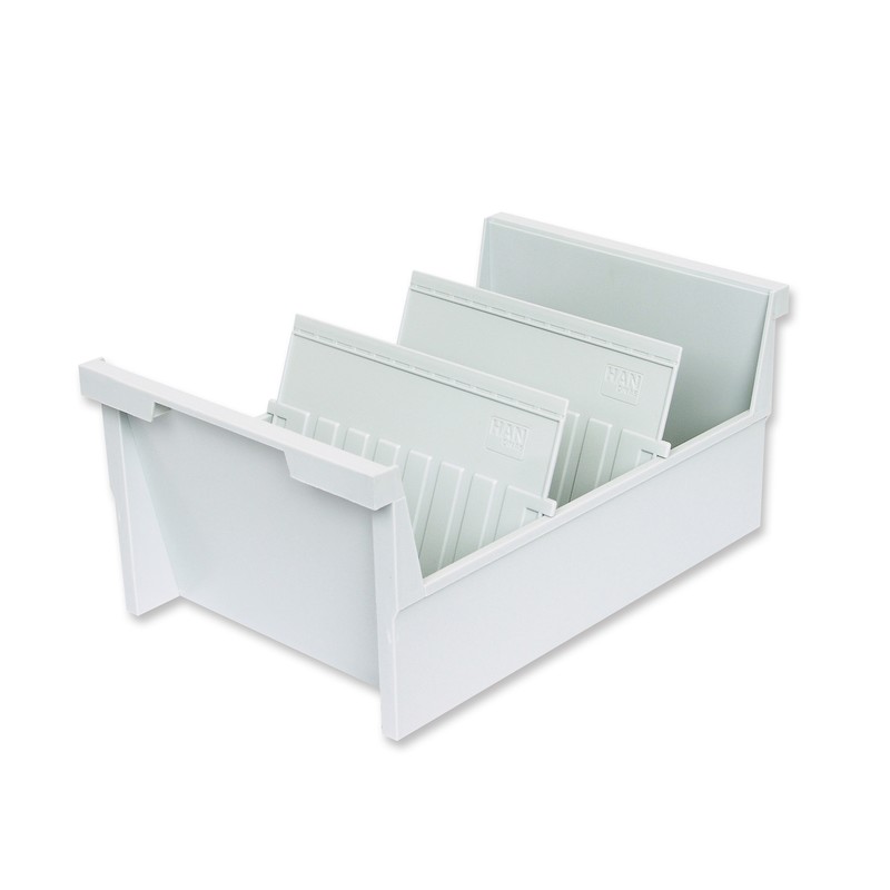 Открытая горизонтальная картотека Han формата А5 изготовлена из пластика светло-серого цвета, размеры — 325×226×160 мм. Предназначена для удобного хранения и систематизации карточек и документов. Вмещает до 1000 картонных карточек (в комплект не входят). Картотека поставляется с двумя пластиковыми разделителями и двумя прозрачными индексными окнами. Всего можно установить до 13 разделителей (приобретаются отдельно).