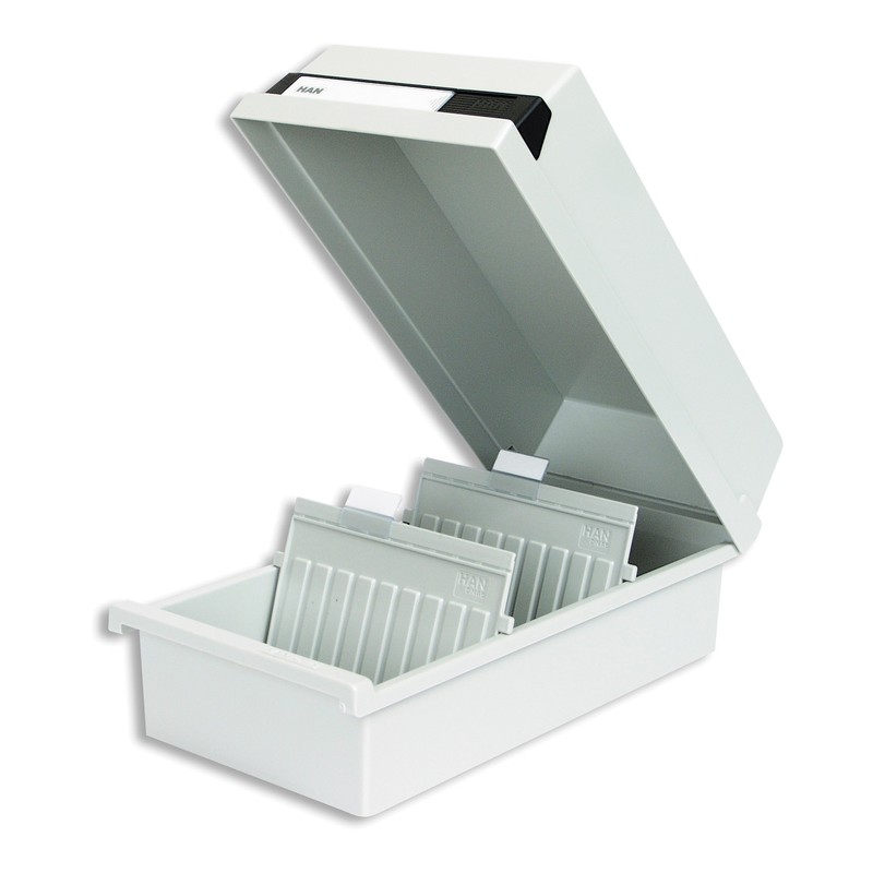 Закрытая горизонтальная картотека Han формата А6 изготовлена из пластика светло-серого цвета, размеры — 360×177×140 мм. Крышка непрозрачная. Картотека предназначена для удобного хранения и систематизации карточек и документов, например, трудовых книжек. Вмещает до 1300 картонных карточек (в комплект не входят). Поставляется с двумя пластиковыми разделителями и двумя прозрачными индексными окнами. Всего можно установить до 26 разделителей (приобретаются отдельно).
