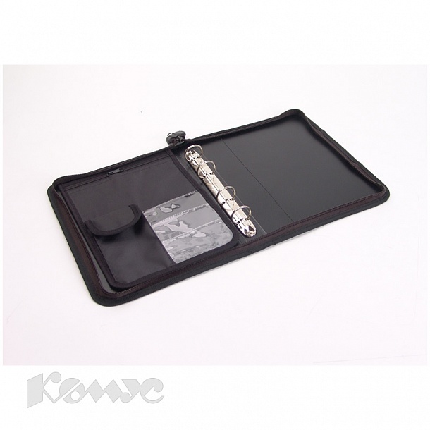 Папка формата А5 из прочного полипропилена черного цвета закрывается на молнию. Внутри — металлический механизм на четырех кольцах для сменного блока бумаги, карман для мобильного телефона, держатели для письменных принадлежностей. Оптимальна для учащихся и студентов.