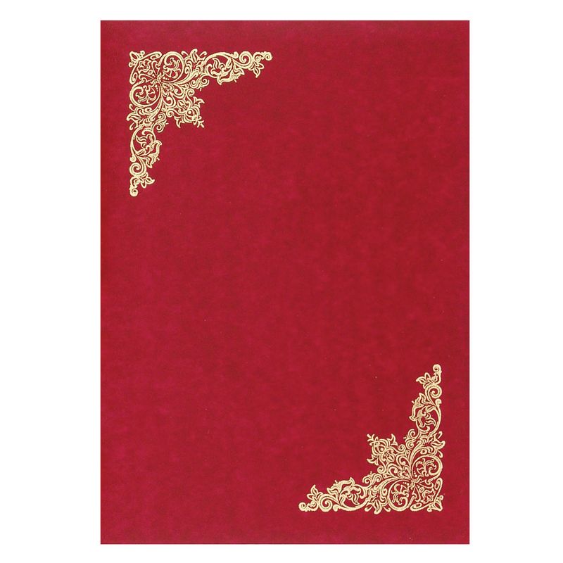 Адресная папка формата А4 изготовлена из бумвинила темно-красного цвета (слой ПВХ на бумажной основе). На обложку методом тиснения золотой фольгой нанесен орнамент (виньетка). Внутри есть фиксирующая ленточка для бумаг. Адресная папка подходит для поздравлений, подачи документов на подпись. Внутри есть фиксирующая лента.