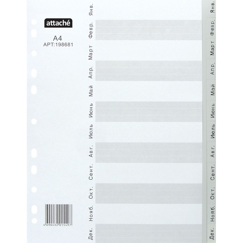 Разделители листов Attache формата А4 серого цвета, облегчающие систематизацию архивных и текущих документов. Выполнены из прочного пластика толщиной 120 мкм. Имеют универсальную перфорацию для подшивки в папки. Разделители листов включают индекс по месяцам (12 разделов).