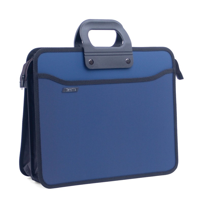 Папка-портфель изготовлена из прочного пластика толщиной 0,9 мм. Габаритные размеры, превышающие стандартные, позволяют свободно размещать внутри папки и документы формата А4+. Имеет четыре отделения. Размеры — 390×320 мм. Максимальное расширение портфеля составляет 120 мм. Цвет синий.