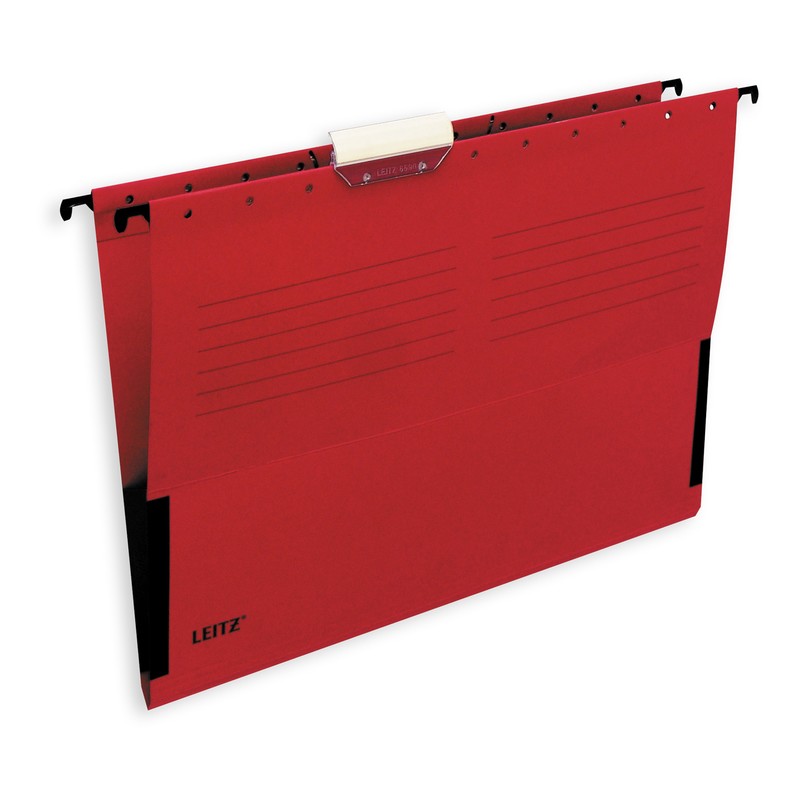 Подвесная папка Leitz формата А4 выполнена из плотного картона красного цвета. Предназначена для размещения в подвесной регистратуре (по бокам имеются специальные крючки). Оснащена передвижным табулятором (разделителем) со сменной этикеткой для маркировки. Размеры без учета крючков — 318×270 мм, с крючками — 348×270 мм.