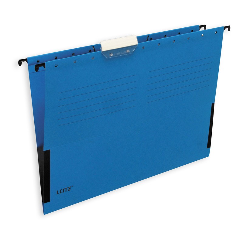 Подвесная папка Leitz формата А4 выполнена из плотного картона синего цвета. Предназначена для размещения в подвесной регистратуре (по бокам имеются специальные крючки). Оснащена передвижным табулятором (разделителем) со сменной этикеткой для маркировки. Размеры без учета крючков — 318×270 мм, с крючками 348×270 мм.
