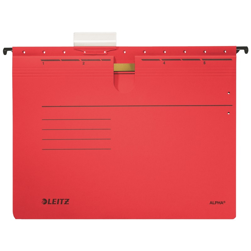 Подвесная папка Leitz Alpha формата А4 выполнена из плотного картона красного цвета. Предназначена для размещения в подвесной регистратуре (по бокам имеются специальные крючки). Есть поля для подписывания. Длина механизма для подшивания — 8 см. Папка оснащена передвижным табулятором (разделителем) со сменными этикетками для маркировки. Вмещает до 25 листов стандартной плотности. Размеры без крючков — 318×270 мм, с крючками — 348×270 мм.