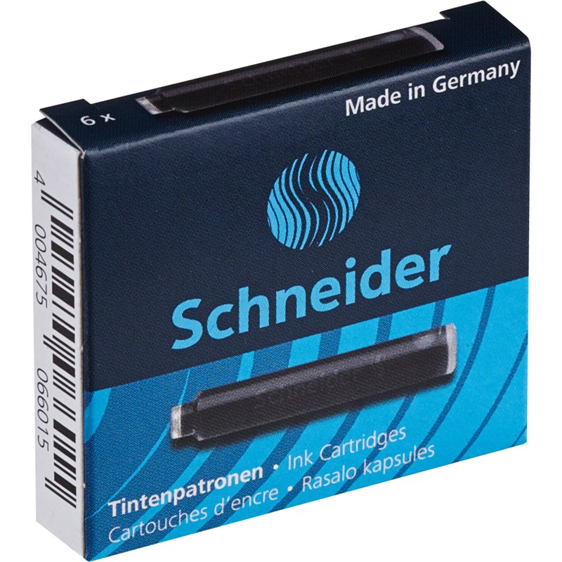 Комплект сменных чернильных патронов Schneider для перьевых ручек, 6 штук в картонной упаковке. Каждый патрон (картридж) длиной 4 см содержит чернила черного цвета.