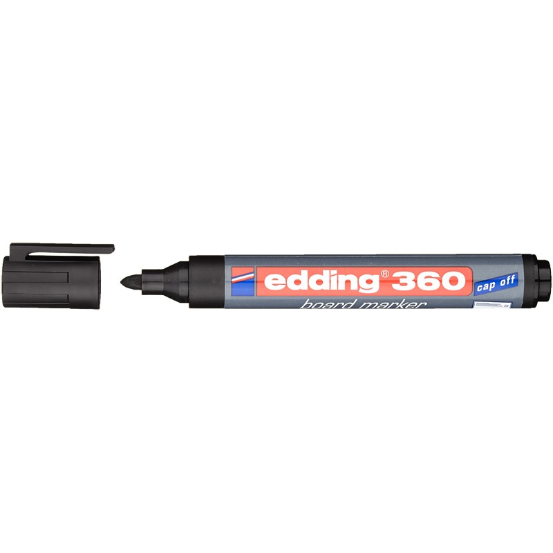 Маркер для досок Edding e-360/1 с технологией "cap off". Круглый наконечник. Пластиковый корпус. Толщина линии письма: 2.2мм Цвет: черный. Стирается сухой губкой Производство - Германия.