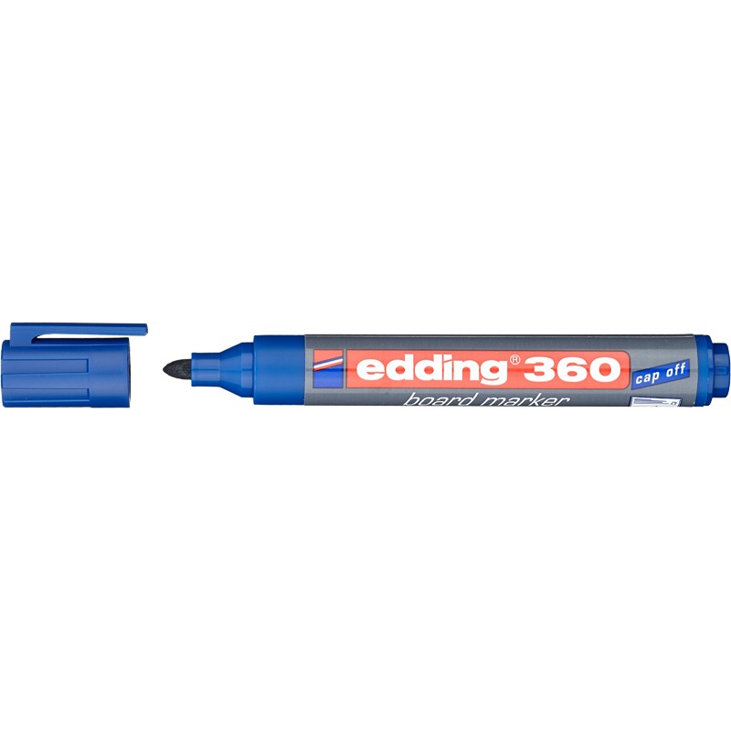 Маркер для досок Edding e-360/3 с технологией "cap off". Круглый наконечник. Пластиковый корпус. Толщина линии письма: 2.2мм Цвет: синий. Стирается сухой губкой Производство - Германия.