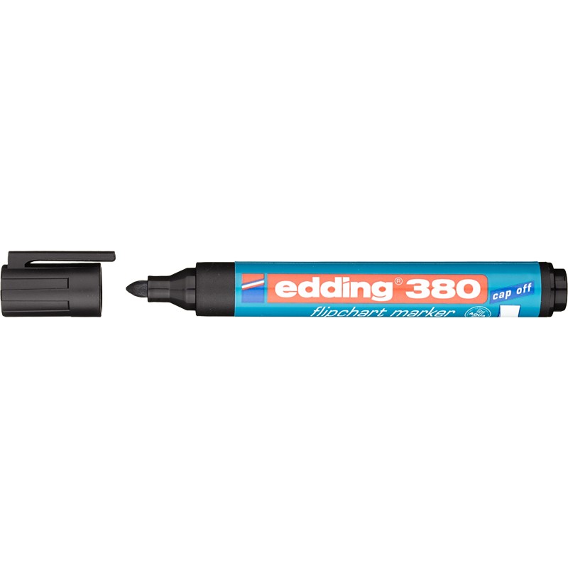 Маркер для флипчартов Edding E-380/1с технологией "cap off" Круглый наконечник. Пластиковый корпус. Толщина линии письма: 2.2мм Цвет: черный. Производство - Германия.