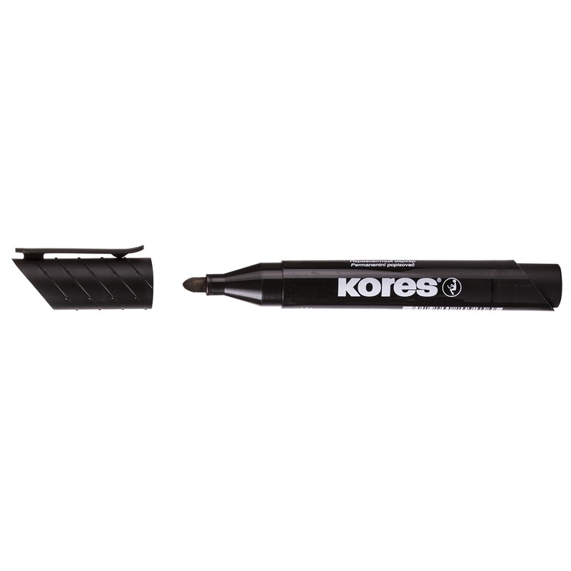 Перманентный маркер Kores 20930 подходит для письма на любых поверхностях. Эргономичный корпус изготовлен из пластика. Круглый наконечник обеспечивает толщину линии от 1,5 до 3 мм. Страна производства — Чехия. Нестираемые чернила. Наличие системы Cap Off. Цвет — черный.