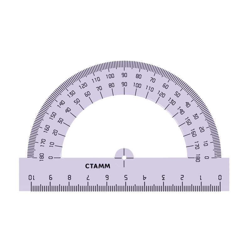 светло-фиолетовый . Имеет180-градусную шкалу. Нижняя часть представляет собой линейку длиной 10 см. Шкалы и логотип нанесены на транспортир с помощью термопечати. Предназначены для чертежных работ. -