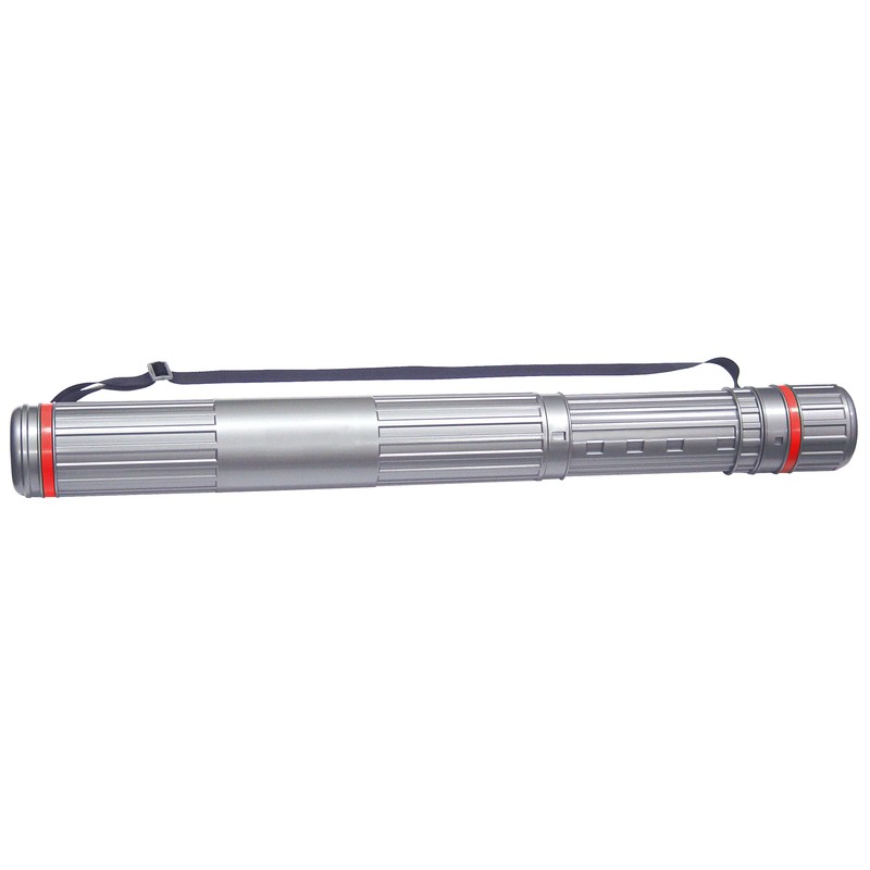 Тубус телескопический на ремне серого цвета. Длина 63-110 см, диаметр 9 см. Предназначен для транспортировки и хранения чертежей, форматом А4 - А1, а также рисунков и рекламных плакатов.