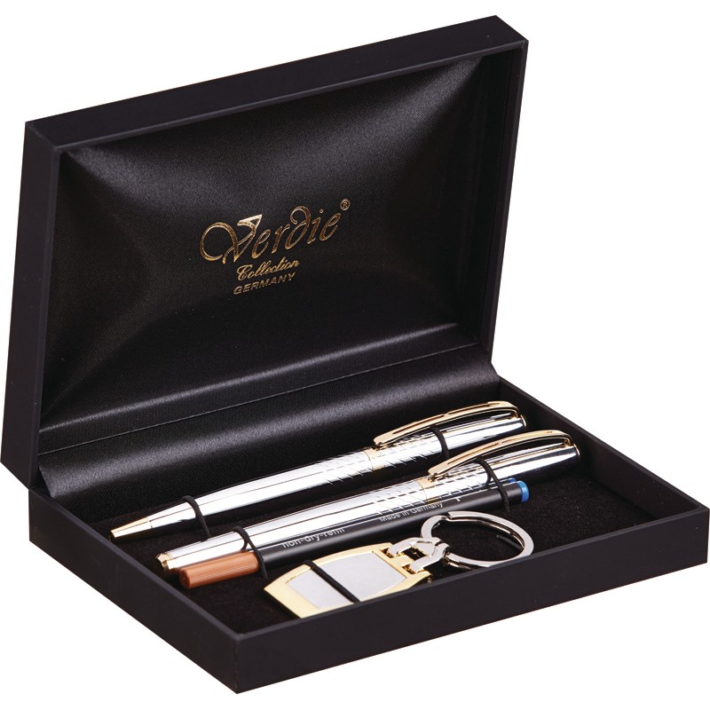 Комплектация: шариковая ручка, роллер, брелок, подарочный футляр.
