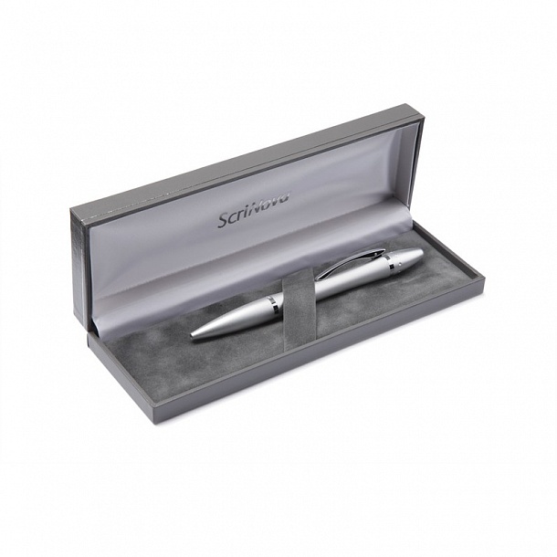 Scrinova Premium Lady 89116 — стильная шариковая ручка для современных женщин. Корпус выполнен из стали в сочетании с алюминием, цвет — матовый серебристый. Оснащена поворотным механизмом. Комплектуется подарочным футляром и стержнем формата G2 с пастой черного цвета.