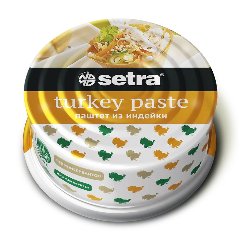 Паштет Setra готовится из мяса индейки. Отличается полным отсутствием пищевых добавок (красителей, консервантов, усилителей вкуса). Упакован в жестяную банку, вес 100г. На крышке предусмотрен ключ для удобства открывания.