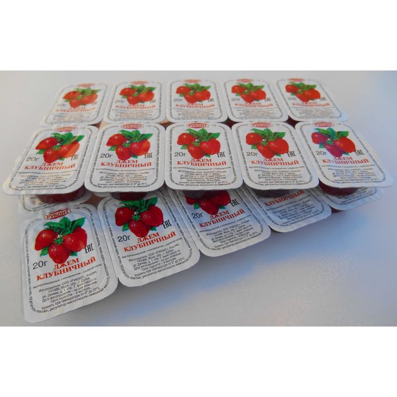 Джем порционный «Руконт» со вкусом клубники — высококачественный продукт, расфасованный в разовые контейнеры по 20 г. в упаковке. Полезные вещества, содержащиеся в клубнике, способствуют выведению пестицидов и радионуклидов из организма, а также повышают тонус сердечно-сосудистой системы. В производстве использованы экологически чистые натуральные ягоды.