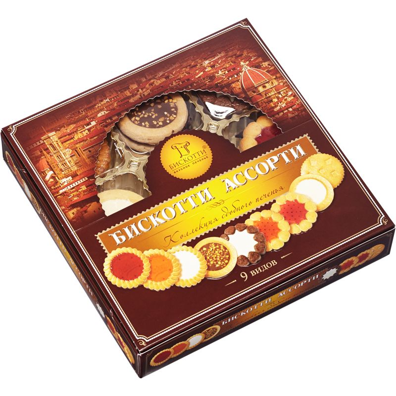 Ассорти из разновидностей сдобного печенья «Бискотти» с различными наполнителями — апельсиновый и вишневый мармелад с натуральным соком, шоколад, кремовая начинка, кокосовый наполнитель. Печенье расфасовано в картонные коробки по 345 гр.
