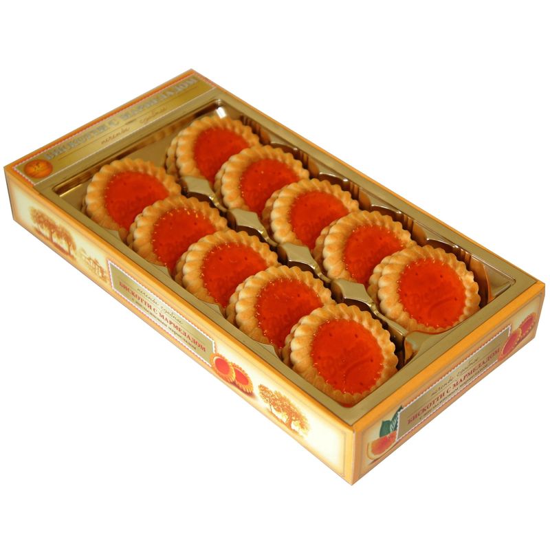 «Бискотти» — это сдобное печенье с начинкой из апельсинового мармелада. Фигурные изделия в виде цветков упакованы в яркую картонную коробку с подложкой из фольги. 100 г печенья имеют энергетическую ценность 404 ккал, содержат 69,95 г углеводов и 11,54 г жиров. Вес 235г.