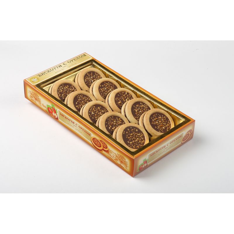 Печенье «Бискотти» с ореховой начинкой и шоколадной глазурью изготовлено из сдобного теста. Поставляется по 20 штук в картонной коробке. Вес 245 г.