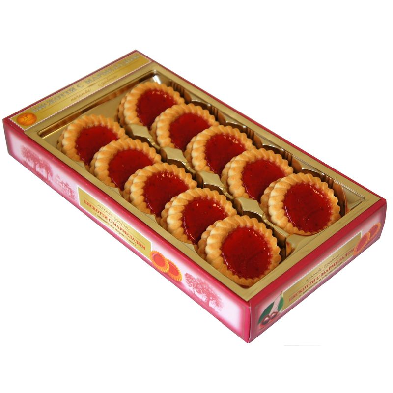 «Бискотти» — это сдобное печенье с начинкой из вишневого мармелада. Фигурные изделия в виде цветков упакованы в яркую картонную коробку с подложкой из фольги. 100 г печенья имеют энергетическую ценность 404 ккал, содержат 69,95 г углеводов и 11,54 г жиров. Вес 235г.