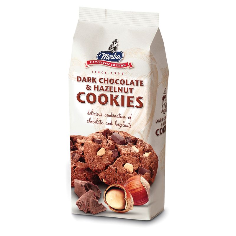 Сладкое песочное печенье Merba содержит не менее 11% лесных орехов и 18% молочного шоколада, а также овсяные хлопья. Рассыпчатое, с выраженным вкусом и ароматом. Расфасовано в мягкие пакеты по 200 гр.