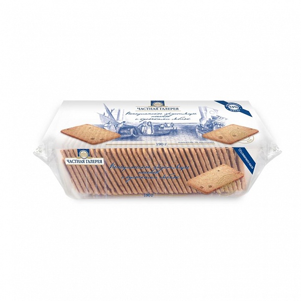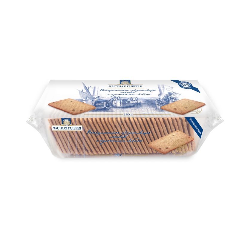 Хрустящее печенье «Венецианское». В состав входят натуральное сливочное масло, яблоки, а также такие пряности, как корица, кардамон, имбирь и гвоздика, придающие изделиям тонкий восточный аромат. Печенье изготовлено без применения искусственных красителей и консервантов. В одной упаковке 190г.