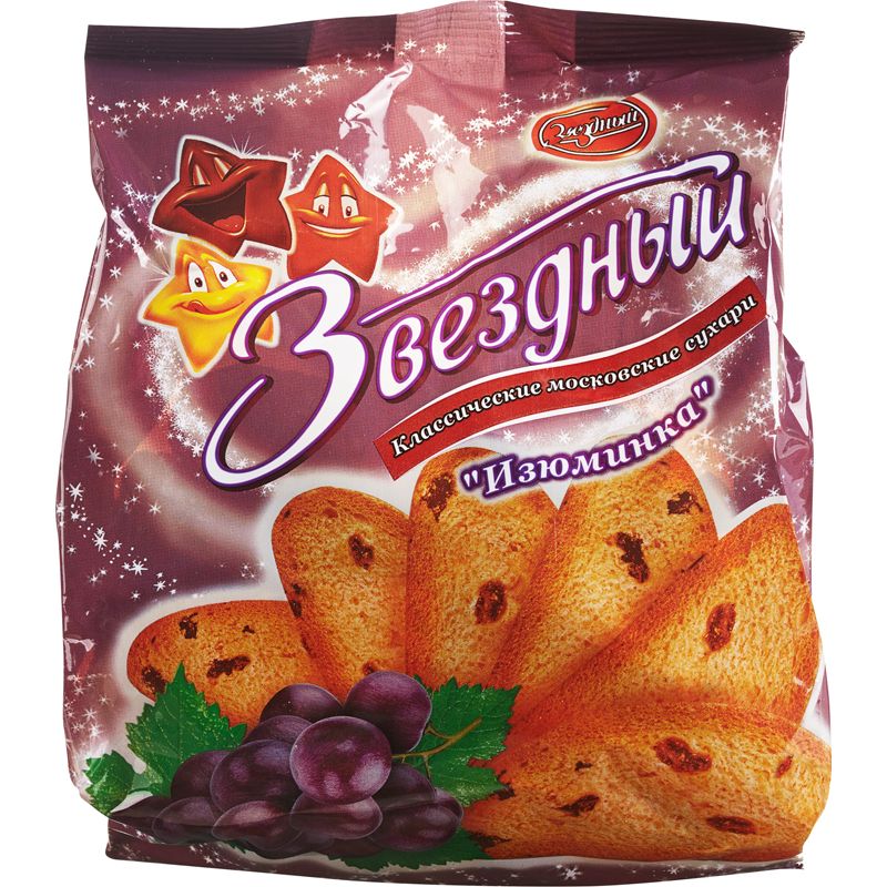 «Звездный» — сухари с изюмом в прозрачных упаковках по 350 г. Сдобное тесто для изделий выполнено из пшеничной муки высшего сорта, в качестве начинки использован сушеный виноград. Сухари изготовлены с учетом международных стандартов качества и безопасности. В 100 г продукта содержится 8,07 г белков, 6,87 г жиров, 68,93 г углеводов. Калорийность составляет 371,67 ккал.