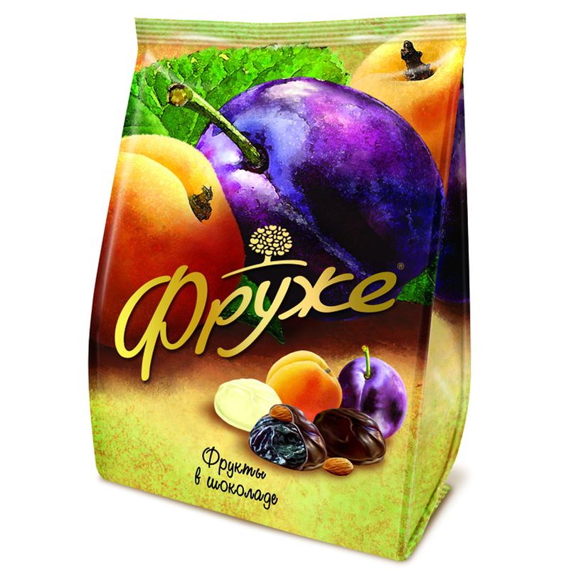 Конфеты ФРУЖЕ Фрукты в шоколаде — это десертное ассорти из конфет нескольких видов. Чернослив и абрикос в молочном шоколаде, с добавлением орехов. В упаковке из пленки 190 г конфет в индивидуальной упаковке. Имеет достаточно низкую калорийность за счет содержания в конфетах сухофруктов.