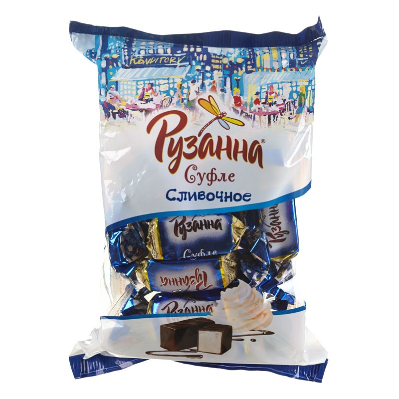 Классическое суфле «Рузанна» с шоколадной глазурью, подходящее в качестве десерта к чаю или кофе. Конфеты прямоугольной формы представлены в пластиковой упаковке. Вес — 200 г.