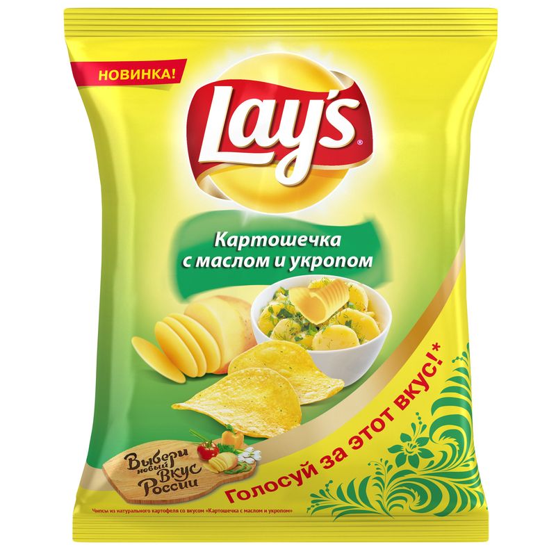 Название торговой марки Lays Торговая марка Lays Схема вложения 18 Вкус масло и укроп Вес, грамм 80 г Вид продукта Чипсы Артикул 327364 -